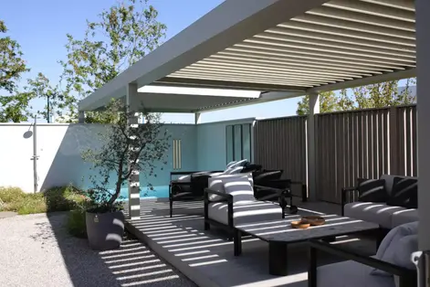 Komfort, Design und Technik erfüllen bei dieser Terrassenüberdachung die höchstmöglichen Standards. Ob freistehend oder an der Wand montiert, die drehbaren Aluminiumlamellen lassen sich ganz nach Ihren Wünschen und Bedürfnissen gestalten.